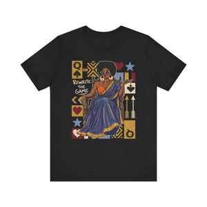 High-definition “Rewrite the Game” graphic with deep blues, warm golds, and Afrocentric geometry that radiates confidence on black fabric.